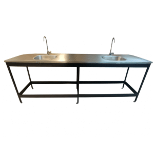 Mesa de lavado de 1.20×0.60×0.90 m con una tarja integrada y llave de cuello de ganso para agua. Su diseño robusto y funcional la convierte en una opción ideal para laboratorios, talleres y áreas de servicio que requieren una estación de limpieza práctica, estable y eficiente.
